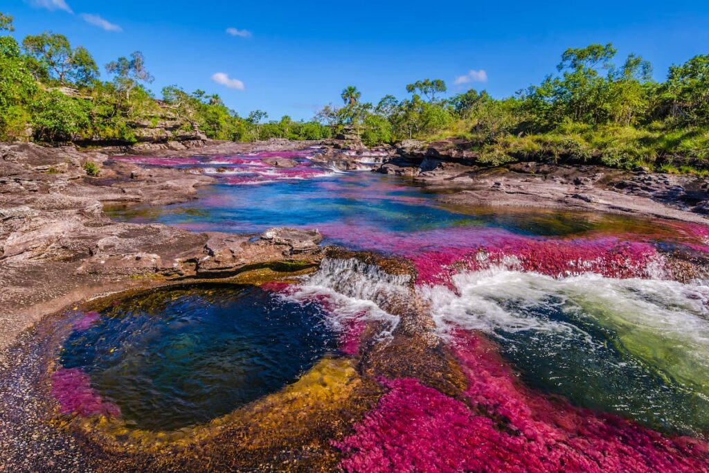 Sus vibrantes colores (rojo, amarillo, azul, verde y negro) se deben a la floración de una planta acuática endémica llamada Macarenia clavigera, que solo se da bajo condiciones específicas de caudal y luz solar.